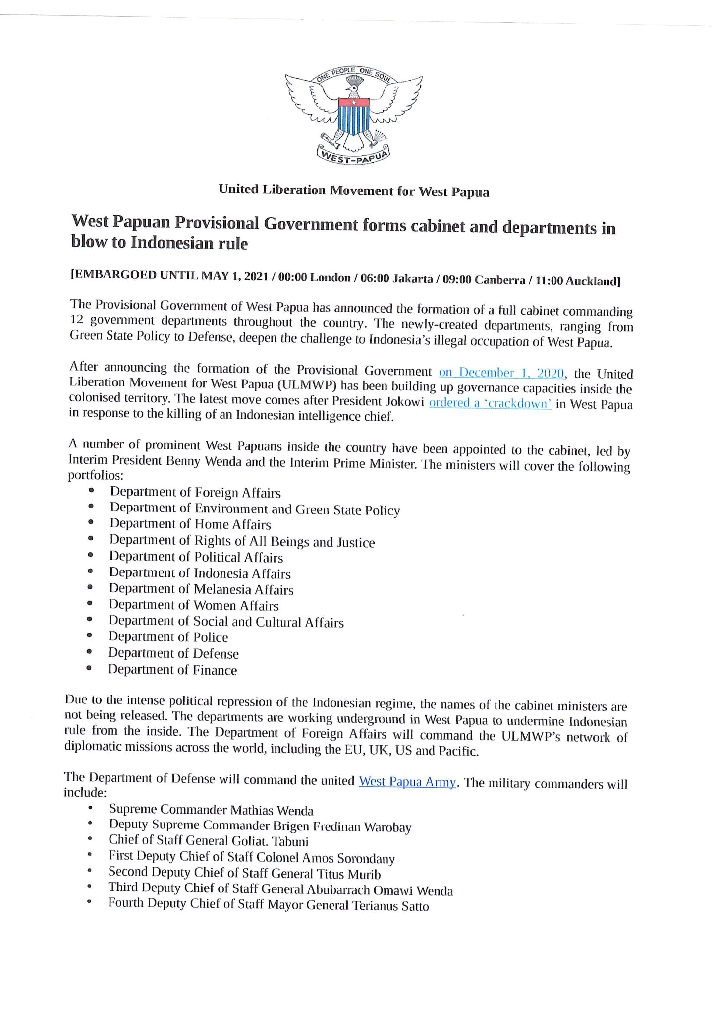 - 12 Departemen dalam Pemerintahan Sementara West Papua;